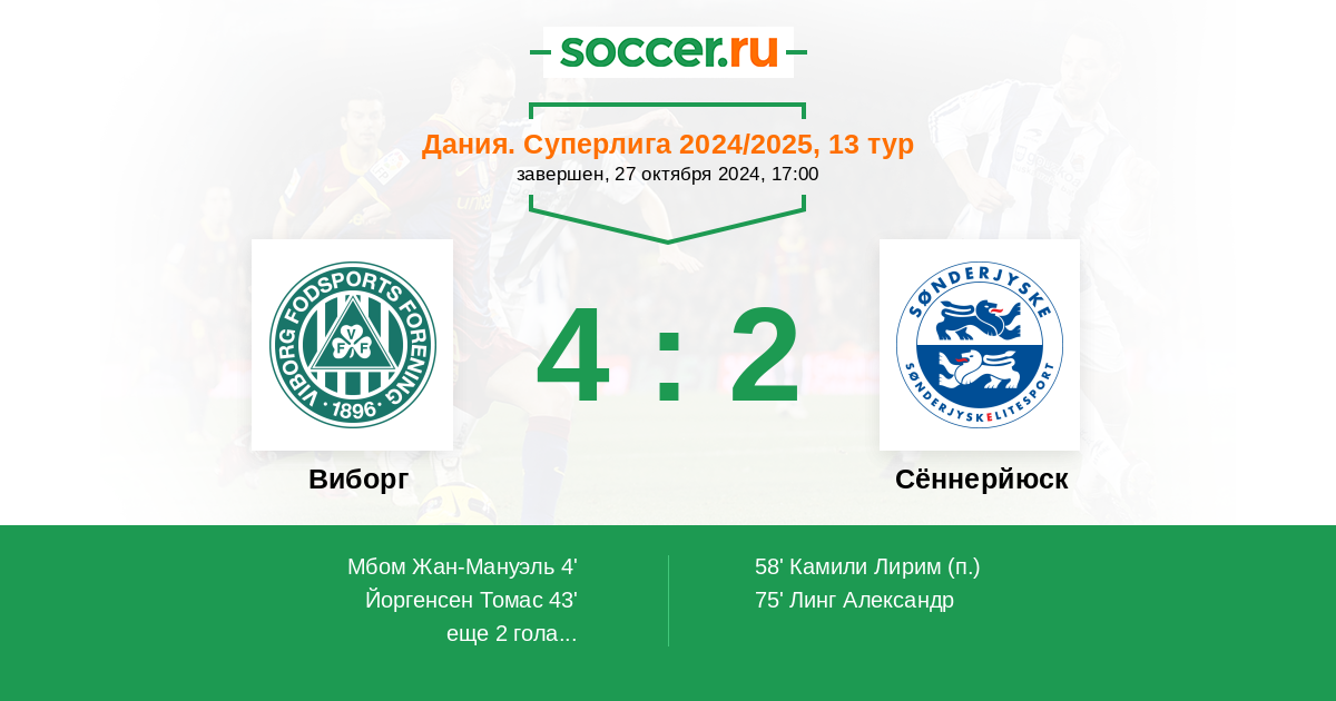4' (1:0) Мбом Жан-Мануэль (18) (Сёндергар Мадс (6))