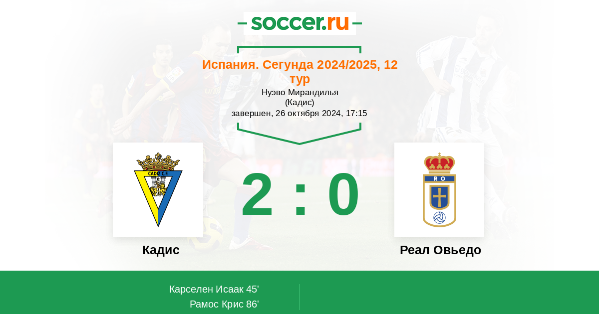 86' (2:0) Рамос Крис (16) (Алькарас Рубен (4))