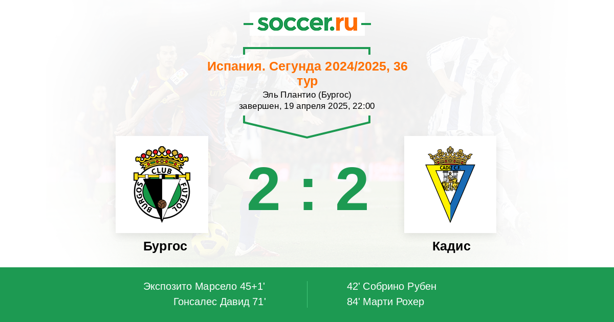 Бургос вполне способны обыграть оппонента. Причем в большей степени не благодаря собственным выдающимся действиям, а скорее из-за откровенной слабости гостей. “Кадис” совсем слаб в последнее время. Подопечные Гаиски Гаритано, допустив роковую осечку, перестали верить в свои силы и не могут забить на протяжении трех туров подряд.