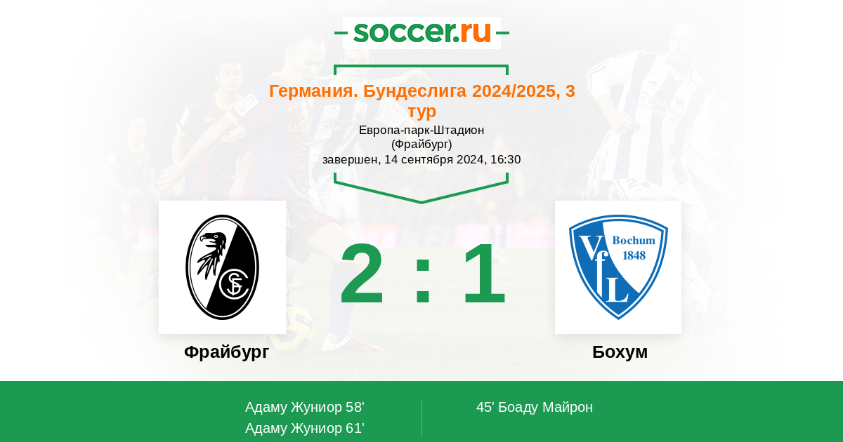 В сегодняшнем матче немецкой Бундеслиги между командами Фрайбург и Бохум смею предположить победу хозяев, потому как они играют при поддержке своих болельщиков, плюс результативнее атакуют, но и гости сумеют забить.