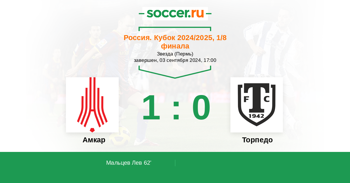 Даже не знаю, что за Торпедо играет с Амкаром и не буду этого выяснять. Доверюсь коэффициентам и поставлю на самый вероятный исход. Тем более, что Амкар команда с историей. Я помню ее в РПЛ. Счет 2:0.