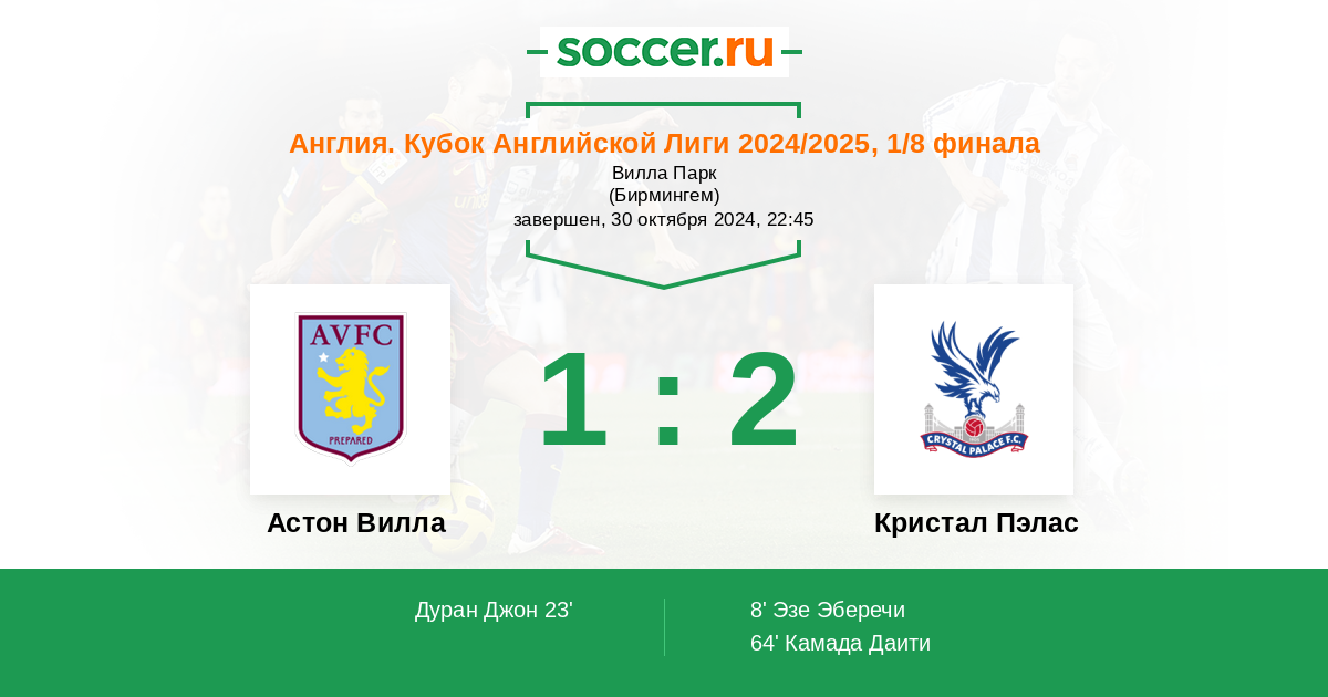 В матче на Кубок Английской Лиги между клубами Астон Вилла и Кристал Пэлас думаю хозяева должны без особых проблем побеждать гостей за счёт своей остро атакующей игре и поддержки зрителей.