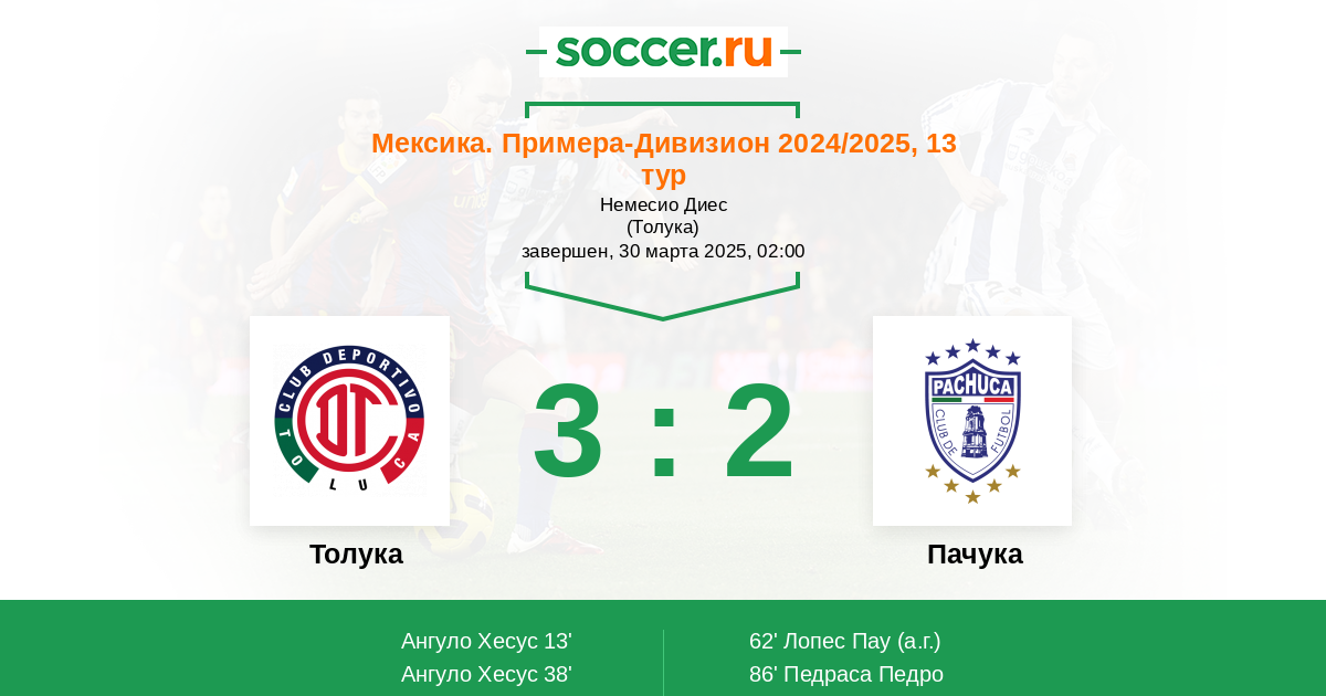 13' (1:0) Ангуло Хесус (10) (Вега Эрнесто (9))