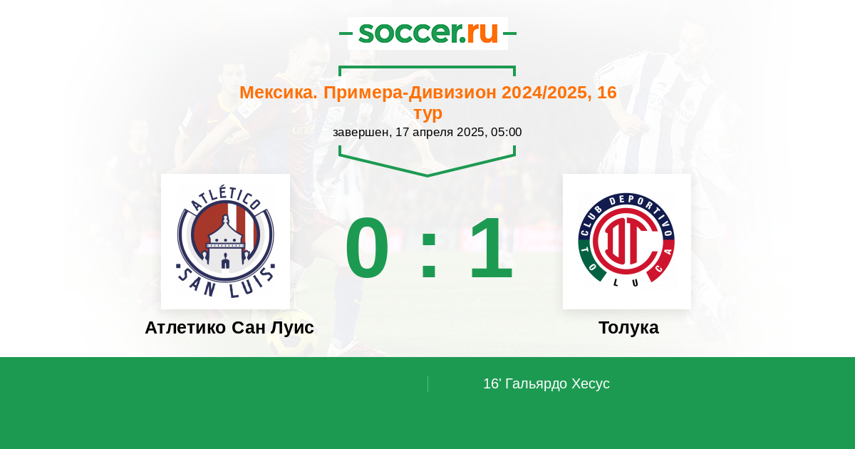 16' (0:1) Гальярдо Хесус (20) (Вега Эрнесто (9))