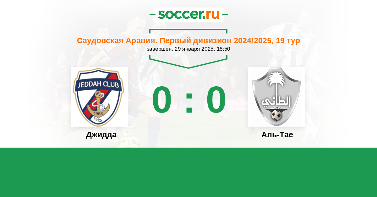 Обе команды проводят не лучший отрезок сезона, но "Джидда Клуб" выглядит куда как хуже со своей затяжной безвыигрышной серией. За последние семь туров хозяевам поля удалось добыть в общей сложности только три очка. В родных стенах коллектив выступает не так уж плохо, но может внезапно провалиться против какого-нибудь откровенного аутсайдера, как это было недавно в матче с "Аль Файзали". После двух поражений кряду более статусный "Аль Таи" будет разъярен и крайне мотивирован.