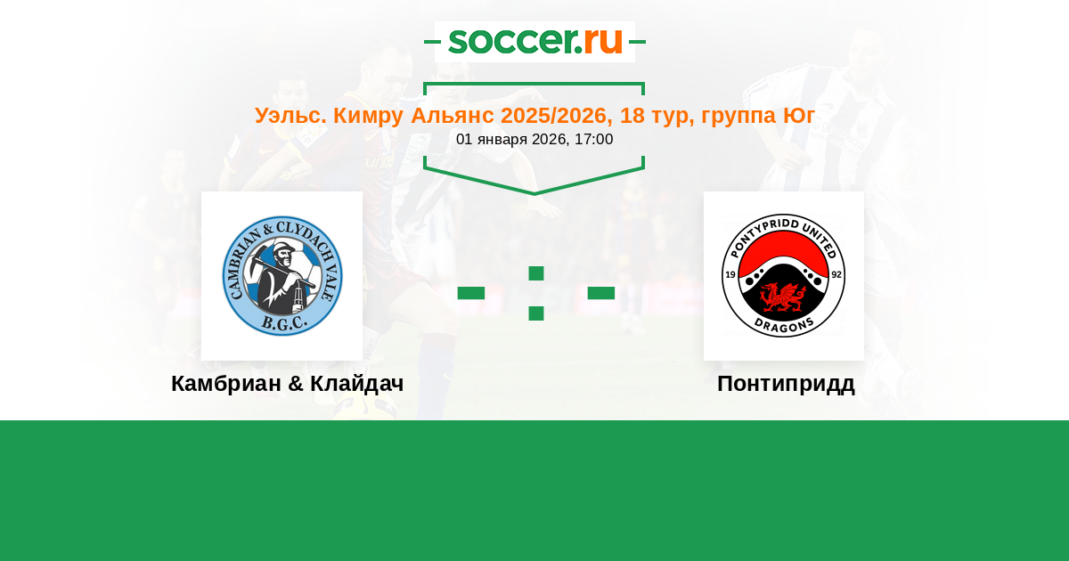 Камбриан & Клайдач - Понтипридд ! Хозяева - лидер группы Юг ( но по потеренным очкам ) , на домашней арене постараются избежать потери очков . В свою очередь гости , находящиеся в не лучшем тур . положении окажут сопротивление .