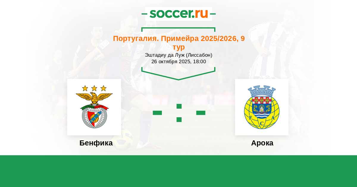 Арока прямо сейчас занимает 11 место в турнирной таблице чемпионата Португалии 🇵🇹. Бенфика третья. На неделе лиссабонская команда играла очередной матч основного этапа Лиги Чемпионов с Ньюкаслом и проиграла. Но на Ароку хватит сил. Победа хозяев.