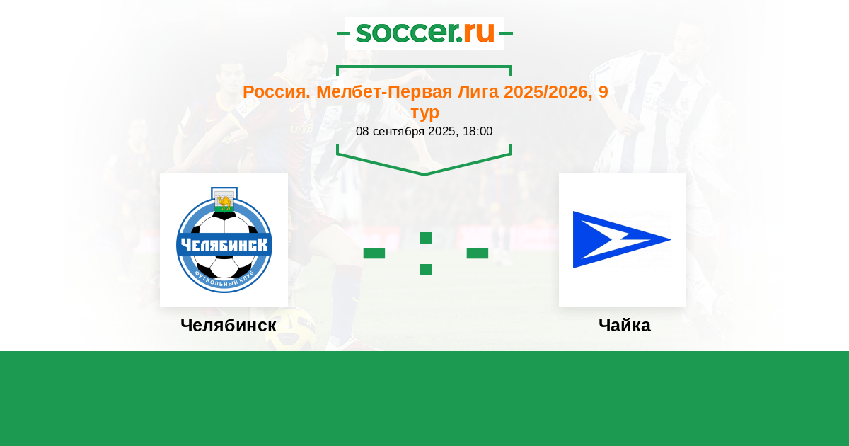 В предстоящем матче 9 - го тура российской Первой Лиги между командами ФК Челябинск и ФК Чайка , моим явным фаворитом на победу является команда хозяев ФК Челябинск , так как они играют дома