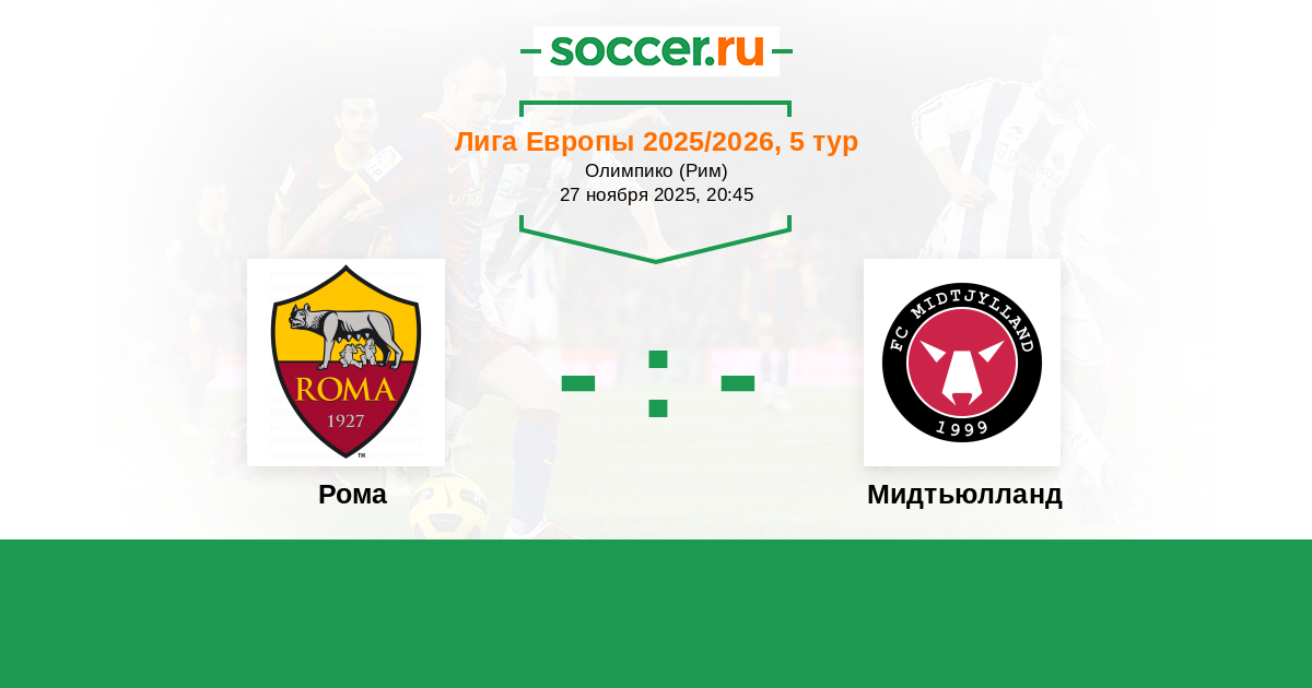 "Мидтъюлланн" громко стартовал в турнире, одержав победы во всех четырёх матчах. Команда Майка Тулльберга выглядит очень смелой и результативной в нападении, поэтому для Франкулину Джу и партнёров по команде будет делом чести показать себя в Риме. Вряд ли кто-то ожидает лёгкой игры для "Ромы", но в это же время "Мидтъюлланн" столкнётся с одной из самых организованных команд Лиги Европы, несмотря на минусы "джаллоросси". Предполагаем, "Рома" добьётся успеха, а сама встреча выйдет результативной.
