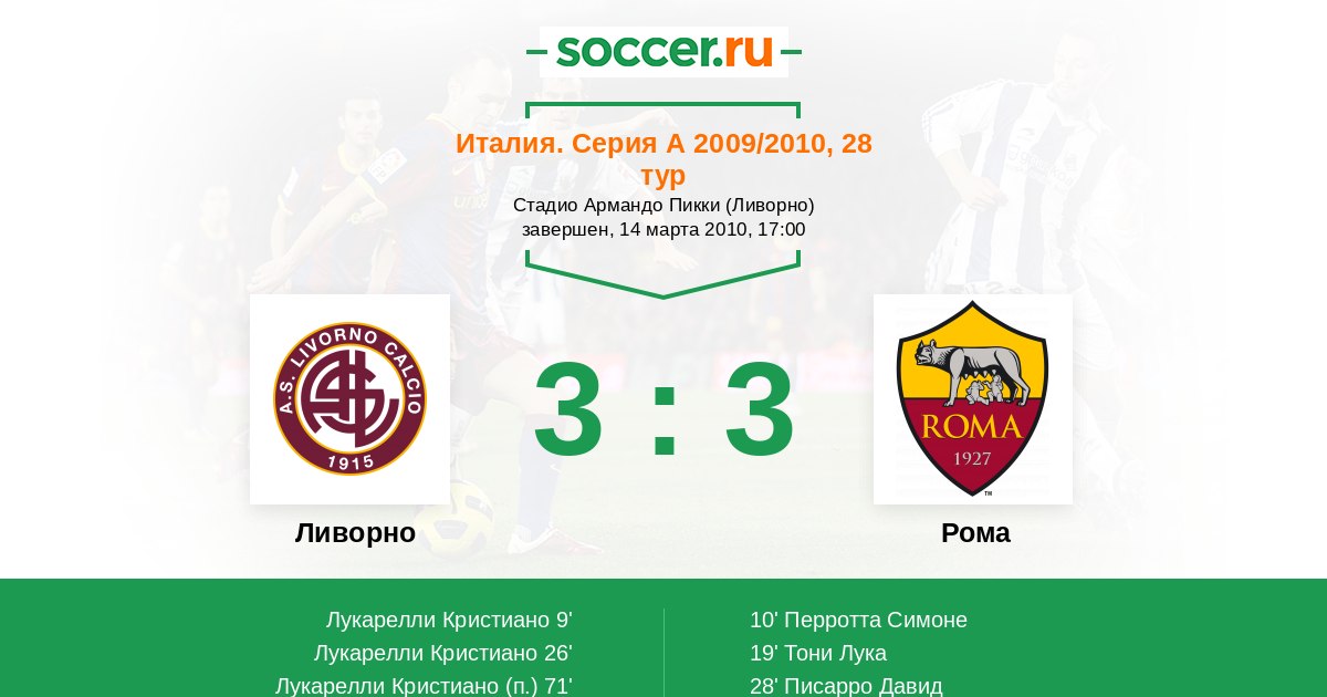 9' (1:0) Лукарелли Кристиано (99) (Моро Давиде (21))
