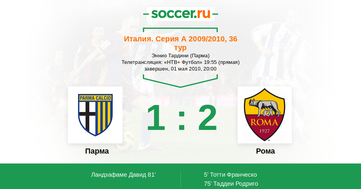5' (0:1) Тотти Франческо (10) (Де Росси Даниэле (16))