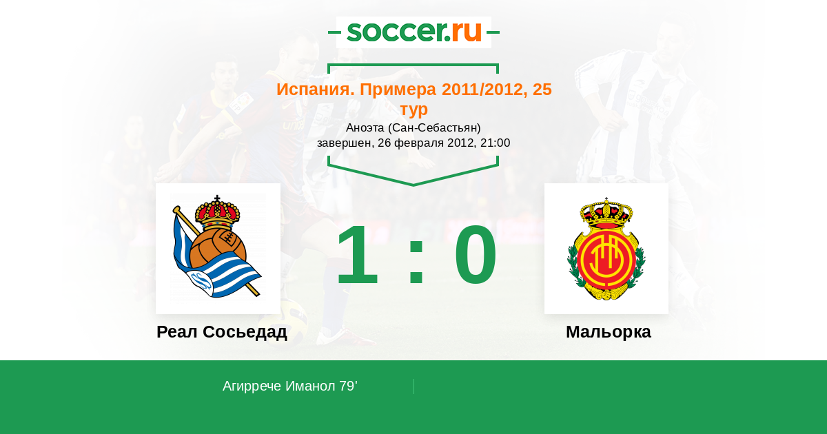 79' (1:0) Агиррече Иманол (9) (Вела Карлос (23))