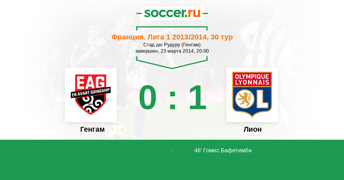 46' (0:1) Гомис Бафетимби (18) (Ляказетт Александр (10))