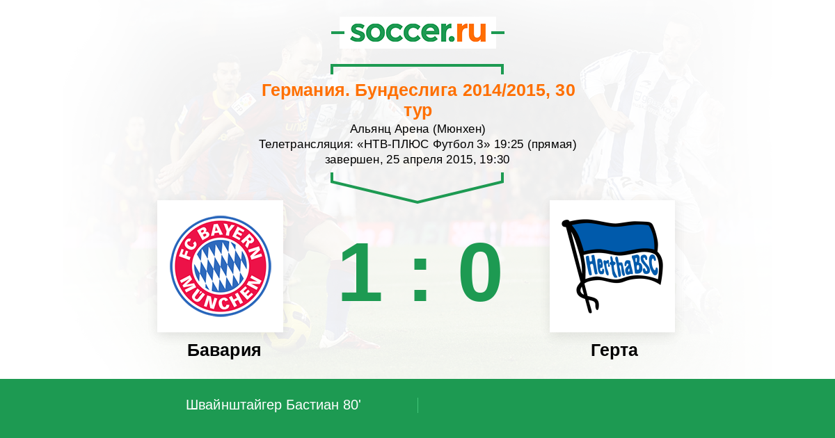 80' (1:0) Швайнштайгер Бастиан (31) (Вайзер Митчелл (30))