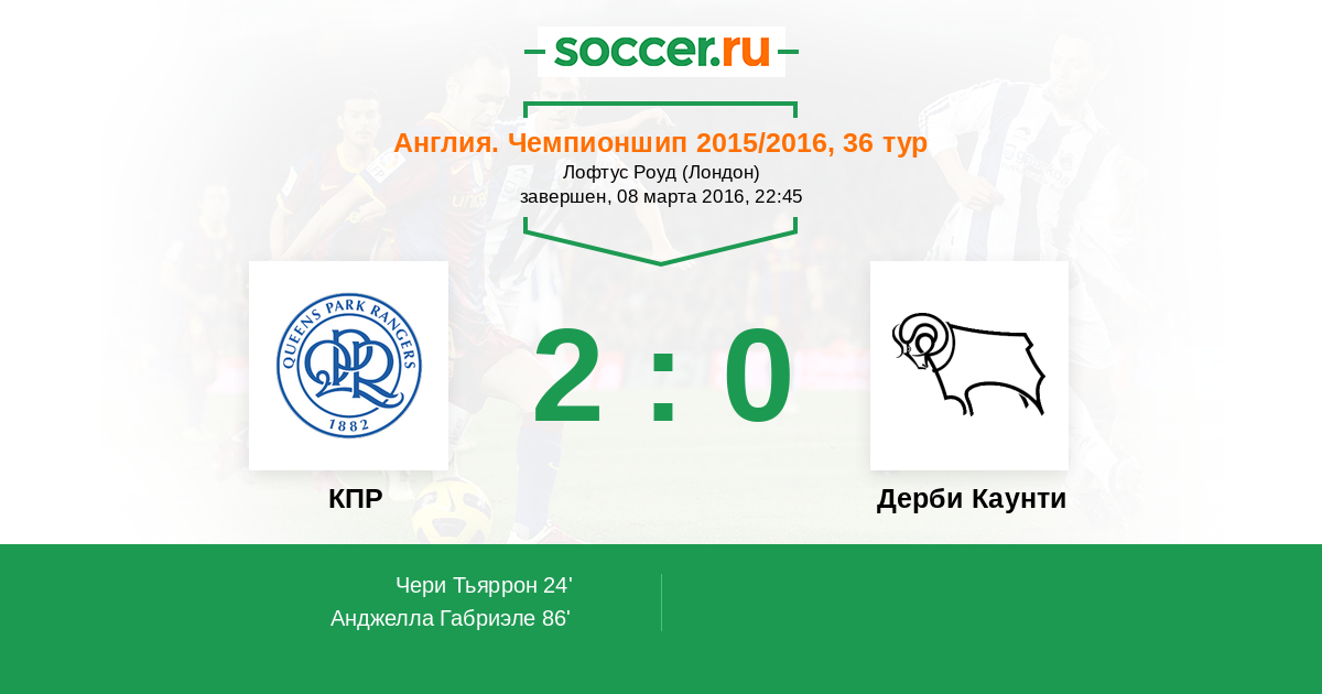 24' (1:0) Чери Тьяррон (8) (Перч Джеймс (24))