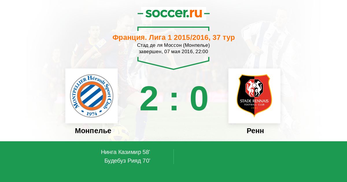70' (2:0) Будебуз Рияд (10) (Нинга Казимир (29))