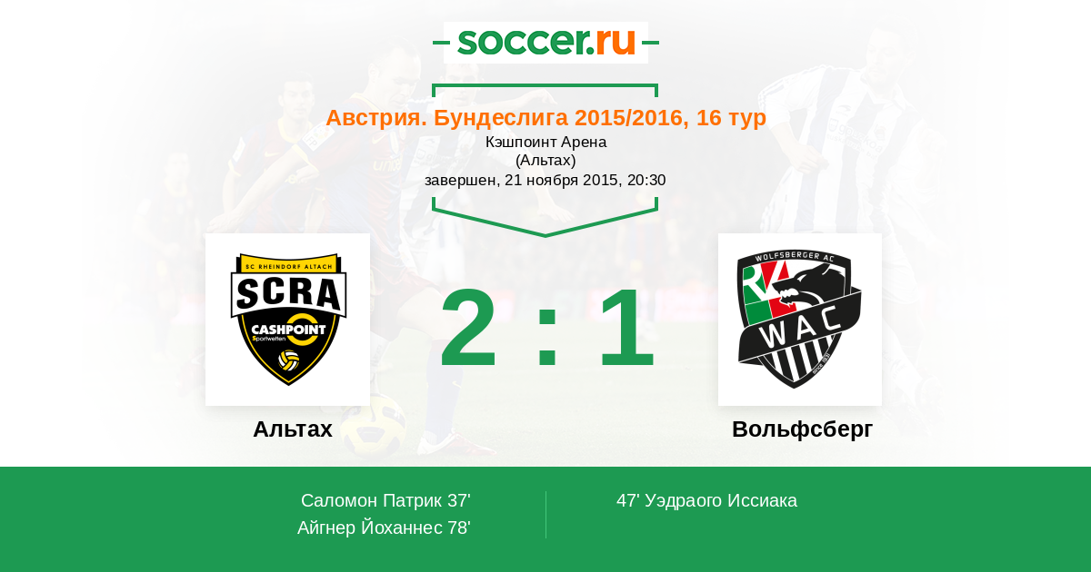 78' (2:1) Айгнер Йоханнес (25) (Тажури Исмаэль (30))