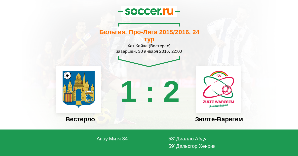 59' (1:2) Дальсгор Хенрик (14) (Де Риддер Стив (10))