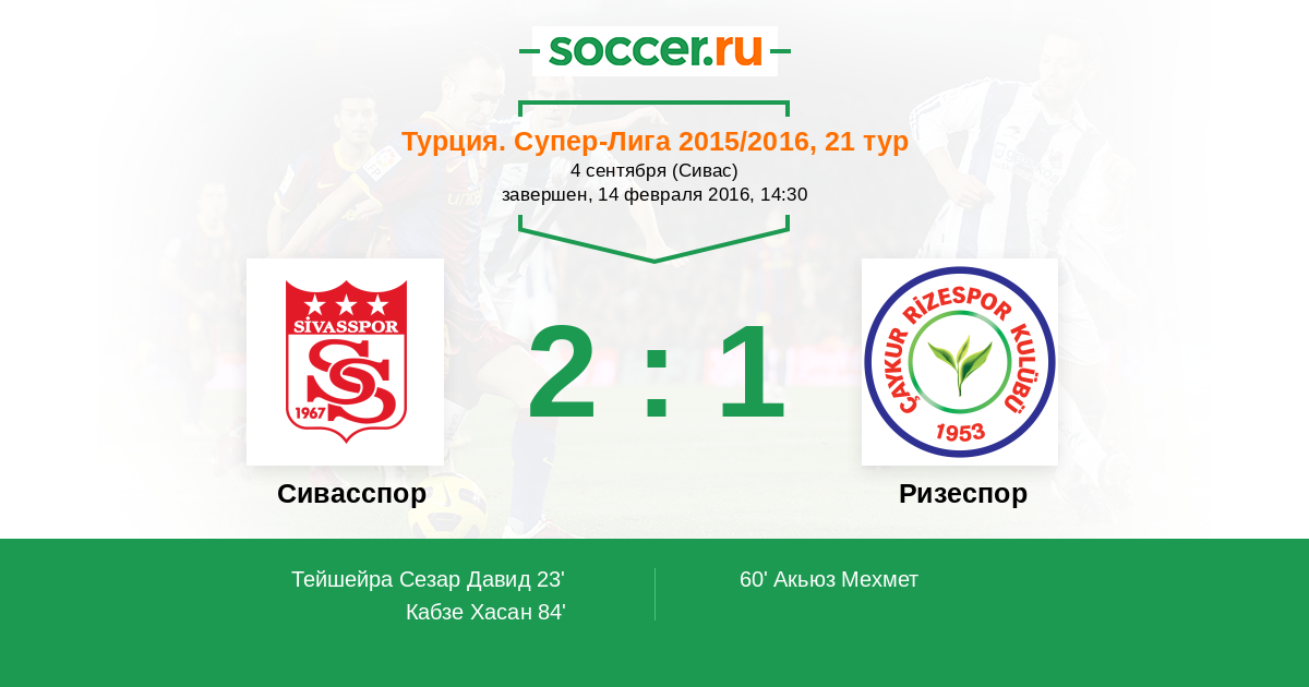 84' (2:1) Кабзе Хасан (99) (Сисиньо (12))