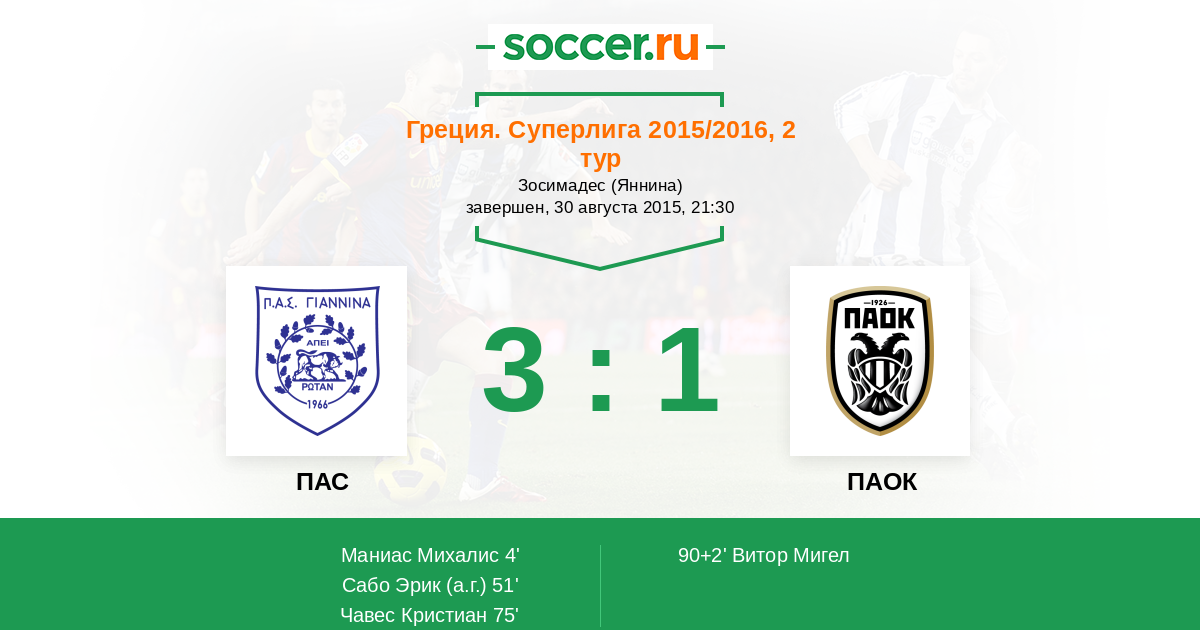 90+2' (3:1) Витор Мигел (15) (Мистакидис Яннис (27))