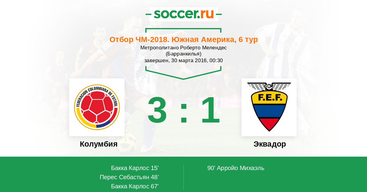 15' (1:0) Бакка Карлос (Родригес Хамес)