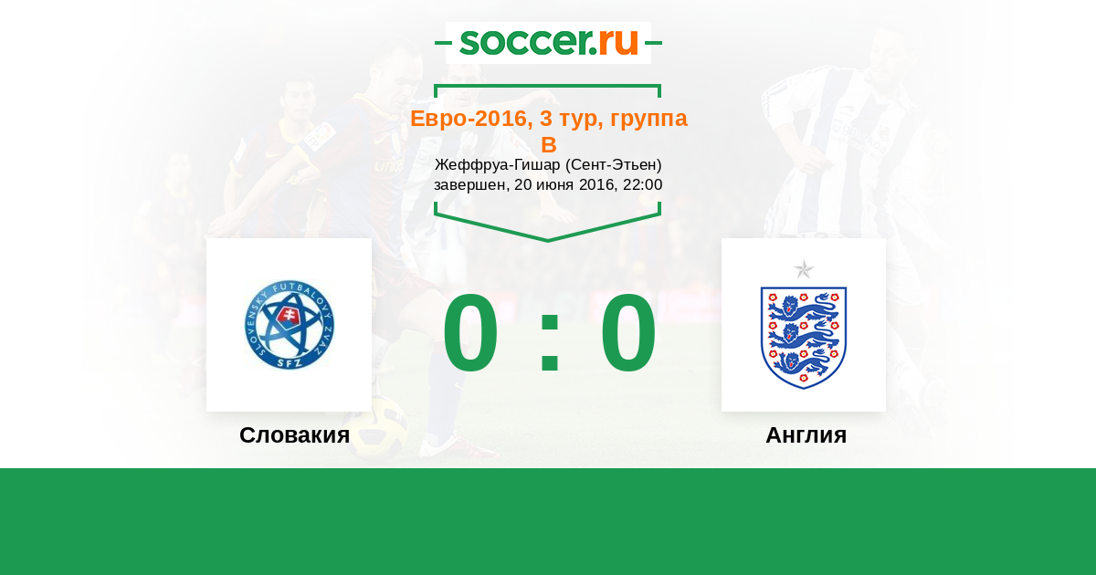 Доброго времени суток, уважаемые любители футбола! Настала пора решающих матчей в группах на ЕВРО-2016 за путевки в плей-офф. Сегодня будут распределять между собой места команды в коллективе под порядковой буквой "В": Англия, Словакия, Уэльс и Россия. Soccer.ru проведет текстовую онлайн-трансляцию матча сборной Словакии против родоначальников футбола - сборной Англии. Игра состоится в 22.00 по московскому времени на стадионе "Жеффруа-Гишар", судить его будет главный арбитр из Испании - Карлос Веласко Карбальо, а помогать вам наблюдать за этим поединком буду я, Роман Земко. Ждем красивого футбола!