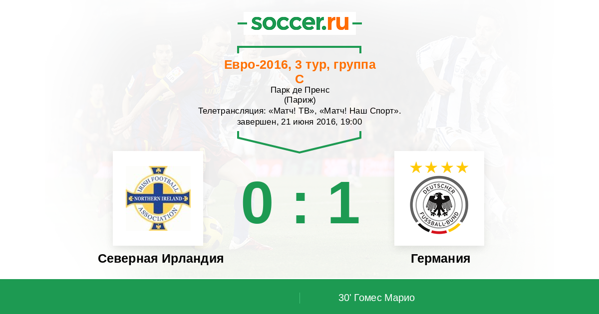 Отличная игра с множеством моментов получилась на "Парк де Пренс". Германия по дополнительным показателям занимает первую строчку в своей группе, а Северная Ирландия оказывается на третьем месте. Множество моментов упустила сегодня Германия, счёт мог быть разгромным, но не сложилось. Германия много комбинировала, держала мяч и создавала опасные моменты, Северная Ирландия сегодня рассчитывала на контратаки. Приглашаем определить лучшего игрока матча в составе каждой команды https://www.soccer.ru/matches/ratings/1000945.shtml. Прямую текстовую онлайн трансляцию матча для вас провёл Старчеус Сергей. Сегодня состоятся ещё два матча Евро-2016, оставайтесь с https://www.soccer.ru!
