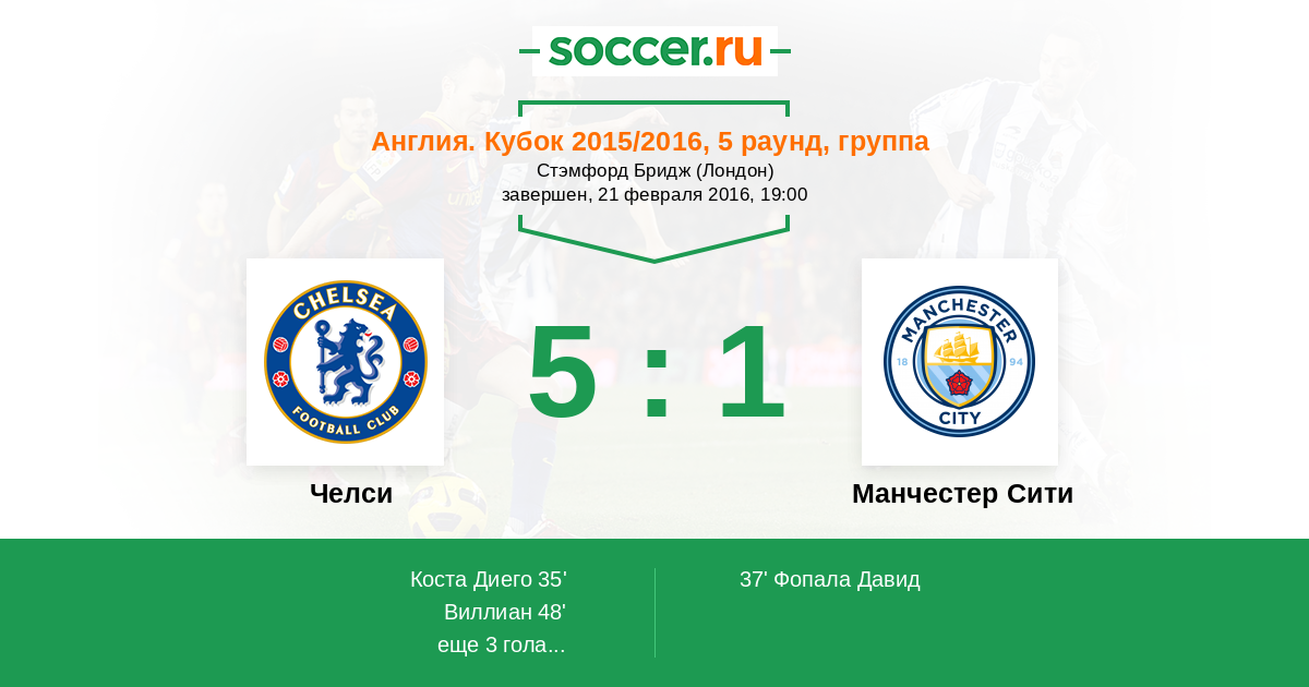 Все. Завершился матч в Лондоне. Челси разгромил Манчестер Сити 5:1 и оформил выход в 1/4 финала кубка Англии.