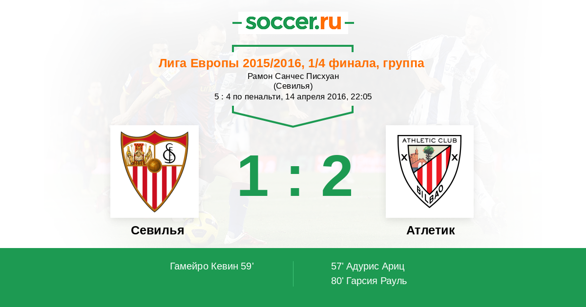 Добрый вечер любители футбола! Приглашаем Вас на ответный матч 1/4 финала Лиги Европы, в котором "Севилья" будет принимать "Атлетик" Бильбао. Довольно неожиданным результатом завершился первый матч между соперниками. "Севилья", не выигравшая ни одного выездного поединка в серьёзных соревнованиях, добилась максимального результата в гостях и сделала серьёзную заявку на выход в полуфинал второго по значимости европейского клубного турнира. Сайт https://www.soccer.ru проведёт прямую текстовую онлайн трансляцию матча, следить за событиями на поле и комментировать игру будет Старчеус Сергей.