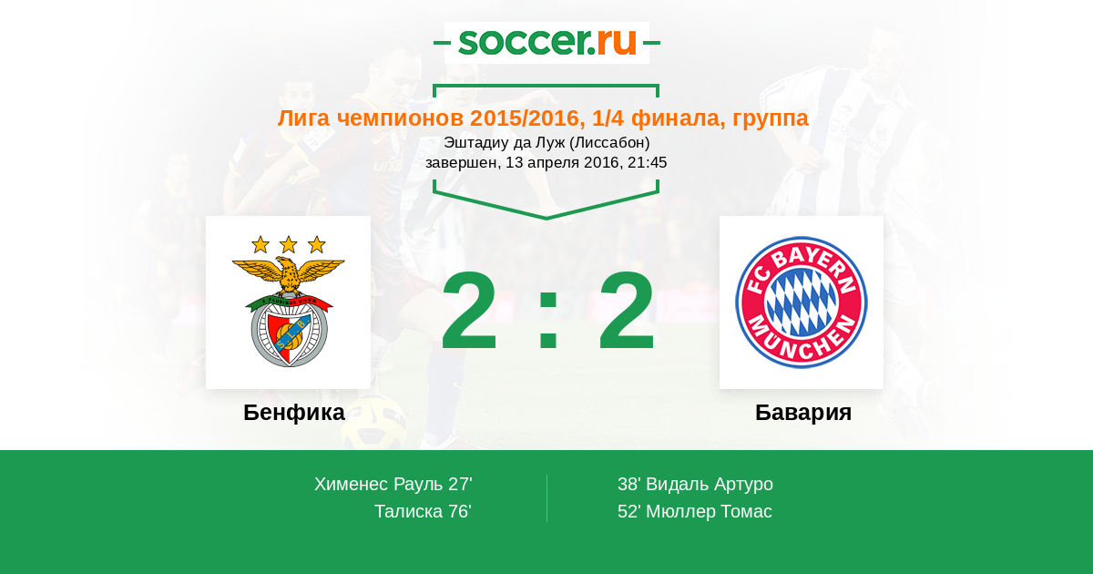 Видаль Артуро (23, п) - 1:1 "Злым гением" оказывается чилиец для "Бенфики"! Отбил Эдерсон из вратарской прострел Лама, однако Видаль был первым на мяче и с линии штрафной пробил точно в пустой дальний угол ворот!