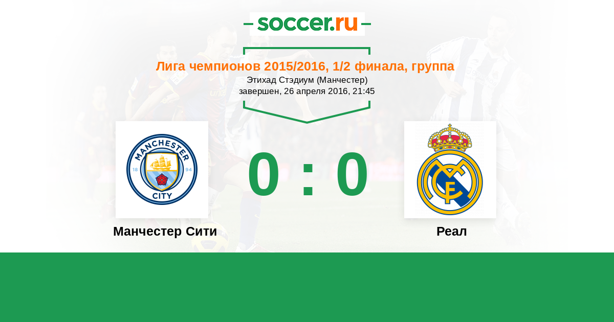 Добрый лигочемпионовский вечер уважаемые поклонники футбола! Сегодня состоится первый полуфинальный матч Лиги Чемпионов, "Манчестер Сити" на "Этихад" будет принимать мадридский "Реал". "Горожане" впервые в своей истории пробились в 1/2 финала главного еврокубка и теперь стремятся прыгнуть еще выше. В то же время для "сливочных" вести борьбу за главный трофей европейского клубного футбола — дело привычное. Шестой год кряду мадридский "Реал" вышел в полуфинал Лиги чемпионов – завидное постоянство. "Манчестер Сити" на достигнутом останавливаться не собирается. На "Этихаде" искренне верят в то, что "горожанам" удастся открыть новую страницу в истории клуба. Сайт https://www.soccer.ru проведёт прямую текстовую онлайн трансляцию матча, следить за событиями на поле и комментировать игру будет Старчеус Сергей.