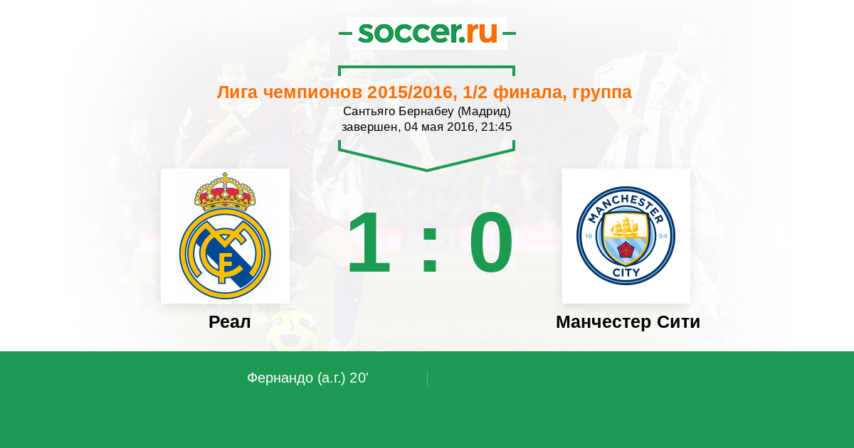 Приветствуем всех поклонников футбола на ответном матче полуфинала Лиги Чемпионов между испанским "Реалом" и английским "Манчестер Сити". На "Сантьяго Бернабеу" в Мадриде команды будут определять, кто станет вторым финалистом Лиги чемпионов. Неделю назад в унылому поединке, который состоялся в Англии, соперники разошлись миром, не забив при этом ни одного мяча. Поможет ли преимущество своего поля и значительно больший опыт выступлений на подобном уровне "сливочным" отпраздновать итоговую победу? Сайт https://www.soccer.ru проведёт прямую текстовую онлайн трансляцию матча, следить за событиями на поле и комментировать игру будет Старчеус Сергей.