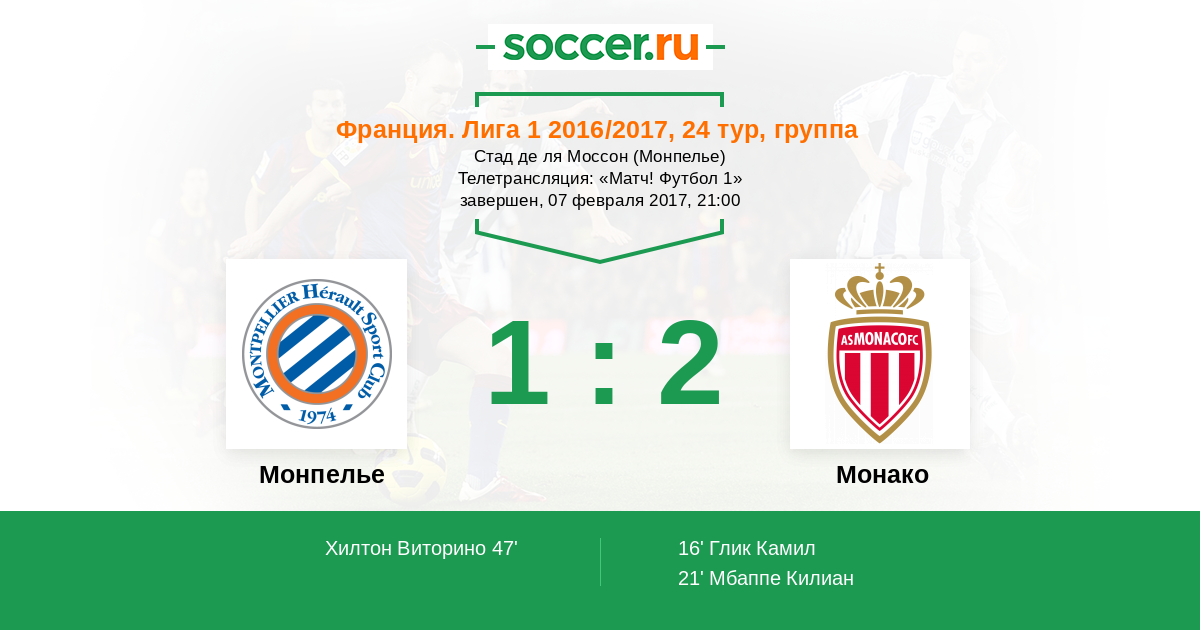 Все! Матч завершен! "Монако" добывает непростую выездную победу над "Монпелье" со счетом 2:1, благодаря которой продолжает лидировать в Лиге ! Довольно быстро "монегаски" открыли счет в матче благодаря голам Камила Глика и Килиана Мбаппе, однако "паладины" в начале второй половины встречи сразу же отыграли один мяч. Но огорчить Даниэля Субашича оборона "Монако" "паладинам" больше не позволяла - 2:1 в пользу "монегасков". Предлагаем Вам выбрать лучших игроков этого матча в составах обеих команд. Для Вас прямую онлайн-трансляцию этого поединка провел Андрей Бабенчук. До новых встреч на https://www.soccer.ru/ !