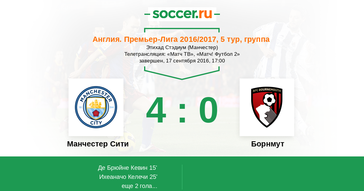 Добрый день всем любителям футбола! Рады приветствовать Вас на матче пятого тура английской Премьер-лиги, в котором на стадионе "Этихад" встретятся местный "Манчестер Сити" и "Борнмут". Для Вас прямую онлайн-трансляцию этого матча проведет Андрей Бабенчук.