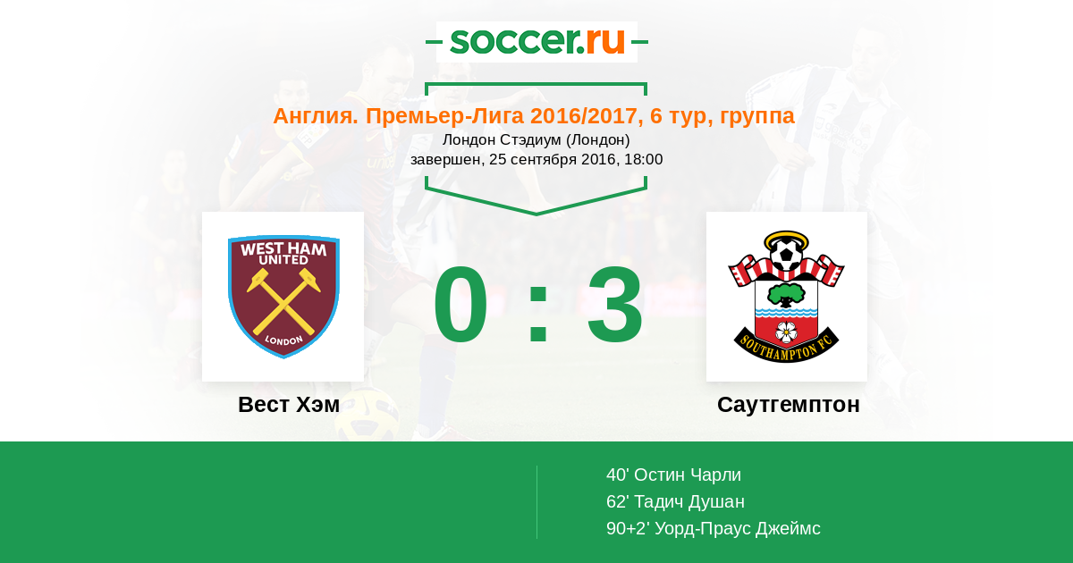 ГОЛ! Джеймс Уорд-Проуз (Саутгемптон) получил отскок на углу штрафной и мощно пробил в нижний угол ворот. Адриан уже не спасал. Счет 0:3.