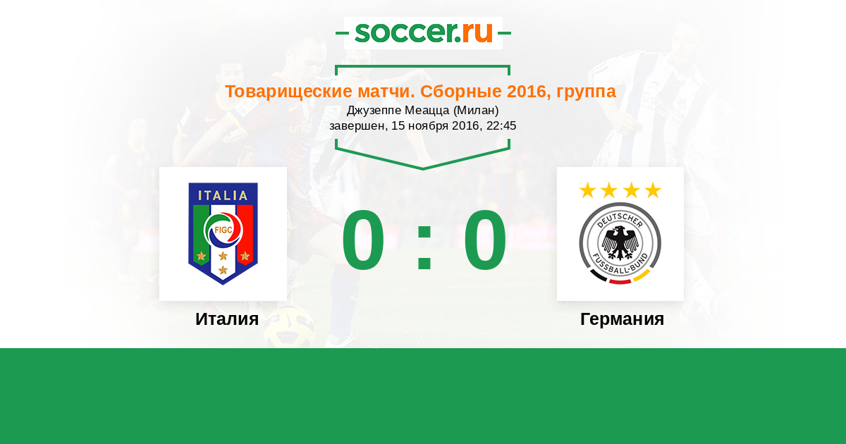 Добрый вечер всем любителям футбола! Рады приветствовать Вас на матче сборных Италии и Германии, который состоится в Милане на стадионе "Джузеппе Меацца". Хоть этот поединок и носит товарищеский характер, но от этого он не станет менее интересным и зрелищным. Прямую онлайн-трансляцию этого матча проведет для Вас Андрей Бабенчук.