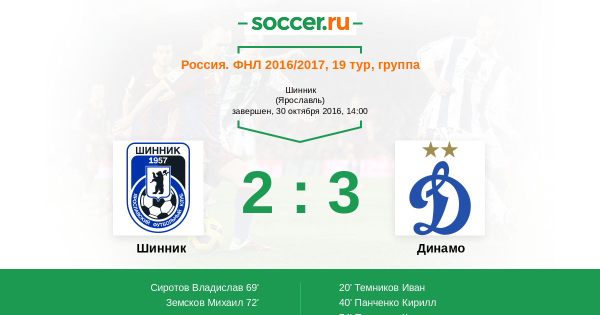 Никудышную подачу на ближнюю штангу выполнил Владислав Ослоновский, после которой Роман Галимов дал финальный свисток, который фиксирует победу "Динамо" в результативном матче - 2:3. Во 2 - м тайме ярославцы сумели за короткий отрезок времени отыграли 2 мяча, но уже через минуту Кирилл Панченко, наверное, морально сломил ярославцев, забив свой второй мяч со штрафного удара. Таким образом, московское "Динамо" после 1 - го круга турнира ФНЛ уверенно занимает первое место в таблице, опережая ближайшего конкурента "Тосно" на 5 очков. "Шинник" пока ещё 4 - й, но к концу дня может упасть и на шестую позицию. На этом всё. С вами был Олег Олезов. Вы можете выбрать лучших игроков матча. Спасибо за внимание и до новых встреч на https://www.soccer.ru!