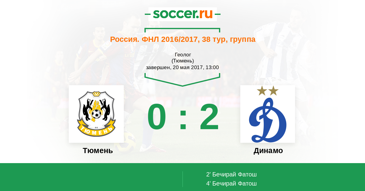 Все! Матч завершен! Московское "Динамо" в отличном настроении завершает победный для себя сезон в Футбольной национальной лиге, одержав в последнем туре выездную викторию над "Тюменью" со счетом 2:0! Дублем в составе "бело-синих" отметился Фатош Бечирай в дебюте матча. Предлагаем Вам выбрать лучших игроков этого матча в составах обеих команд. Для Вас прямую онлайн-трансляцию этого поединка провел Андрей Бабенчук. Оставайтесь на https://www.soccer.ru/!