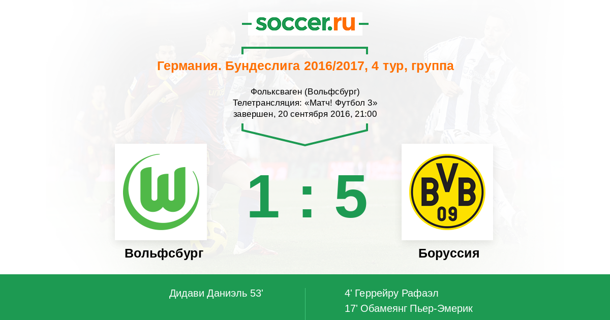 Здравствуйте, уважаемые поклонники немецкого футбола! В сильнейших европейских чемпионатах объявлен "мид-уик", а это значит, что болельщики по всему миру будут следить за матчами своих любимых команд по среди недели в местных первенствах. В "Бундеслиге" старт берет 4-ый тур: в центральной встрече игрового дня "Вольфсбург" примет дома дортмундскую "Боруссию". "Шмели" являются одной из самых забивающих команд чемпионата, как и в Лиге Чемпионов, а "волки" за три тура не пропустили пока ни единого мяча в свои ворота. Крайне любопытно, кто сегодня одержит верх, ведь на старте сезона очки очень важны и для тех, и для других, так как "Бавария" их пока не теряет. "Соккер.ру" непременно будет следить за событиями этой встречи, текстовую онлайн-трансляцию которой для вас проведу я, Роман Земко. Главный арбитр из Берлина Даниэль Зиберт даст стартовый свисток в 21.00 по московскому времени. Не пропустите!