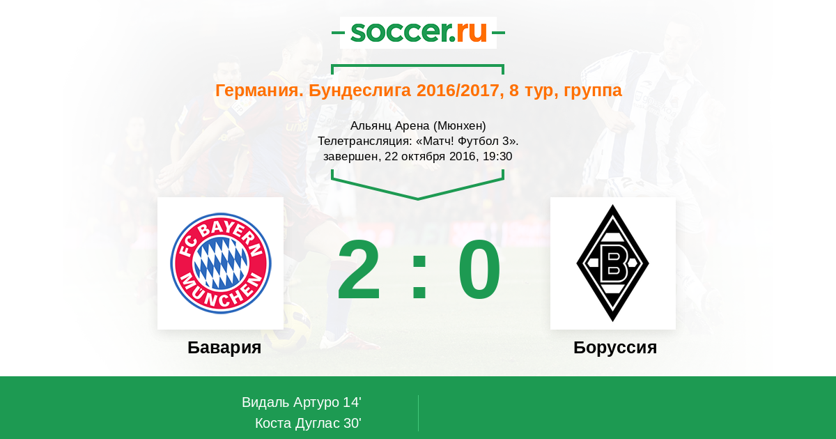 Добрый вечер, уважаемые поклонники футбола! Центральным матчем восьмого тура чемпионата Германии по статусу соперников несомненно станет противостояние на "Альянц-Арене", где "Бавария" примет гладбахскую "Боруссию". В начале недели команды одержали уверенные победы в Лиге Чемпионов, кому удастся перенести победный настрой и на игру чемпионата? Сайт https://www.soccer.ru проведёт прямую текстовую онлайн трансляцию матча, следить за событиями на поле и комментировать игру для вас будет Старчеус Сергей.