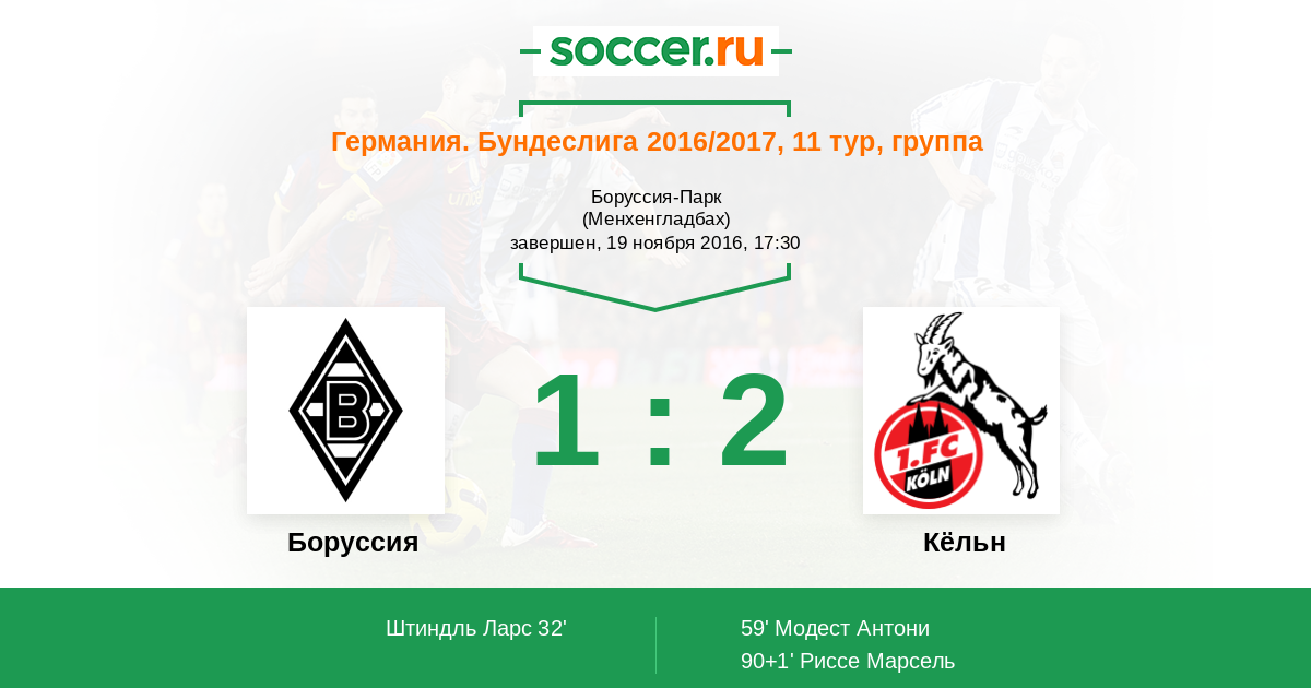 Марсель Риссе (Кёльн) забивает отличным ударом с дальнего штрафного. Вратарь был не готов и пропустил мяч в девятку. Наверное после тренировок штрафные отрабатывает. Счет 1:2.