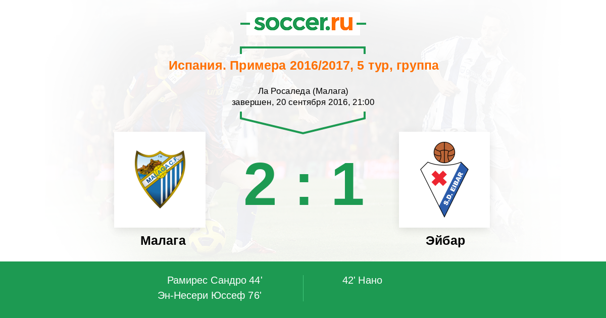 Нано (Эйбар) головой пробил мимо ворот после навеса. Но хороший удар был. Мяч покинул пределы поля. Малага введет мяч в игру ударом от ворот.