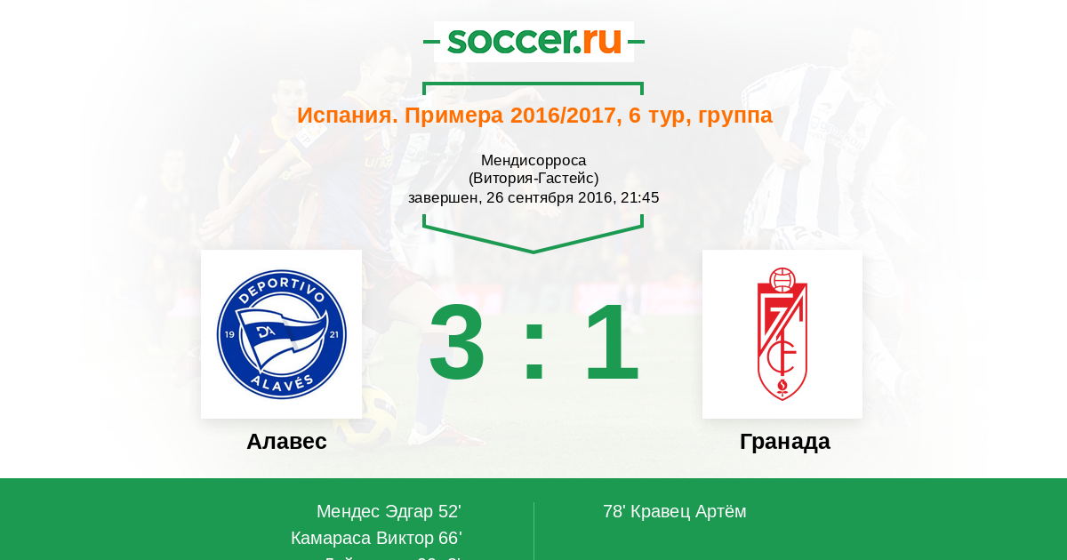 После подачи углового Давид Барраль (Гранада) опасно пробил головой. В нескольких сантиметрах от правой штанги пролетел мяч. Стоит быть построже в обороне. Мяч покинул пределы поля. Алавес введет мяч в игру ударом от ворот.
