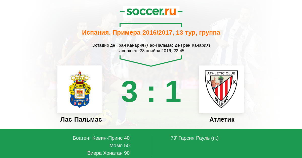 Оборона выбила мяч куда подальше после углового. Бенат (Атлетик) опасно подавал в штрафную. Мяч покинул пределы поля. Лас-Пальмас введет мяч в игру ударом от ворот.