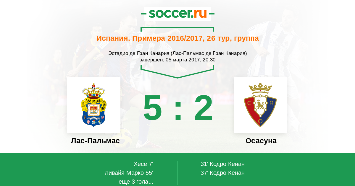 ГОЛ! Хонатан Виера отдал голевую передачу, Хесе (Лас-Пальмас) на углу штрафной получил мяч и нанес точный удар в нижний угол ворот. Счет - 5:2.