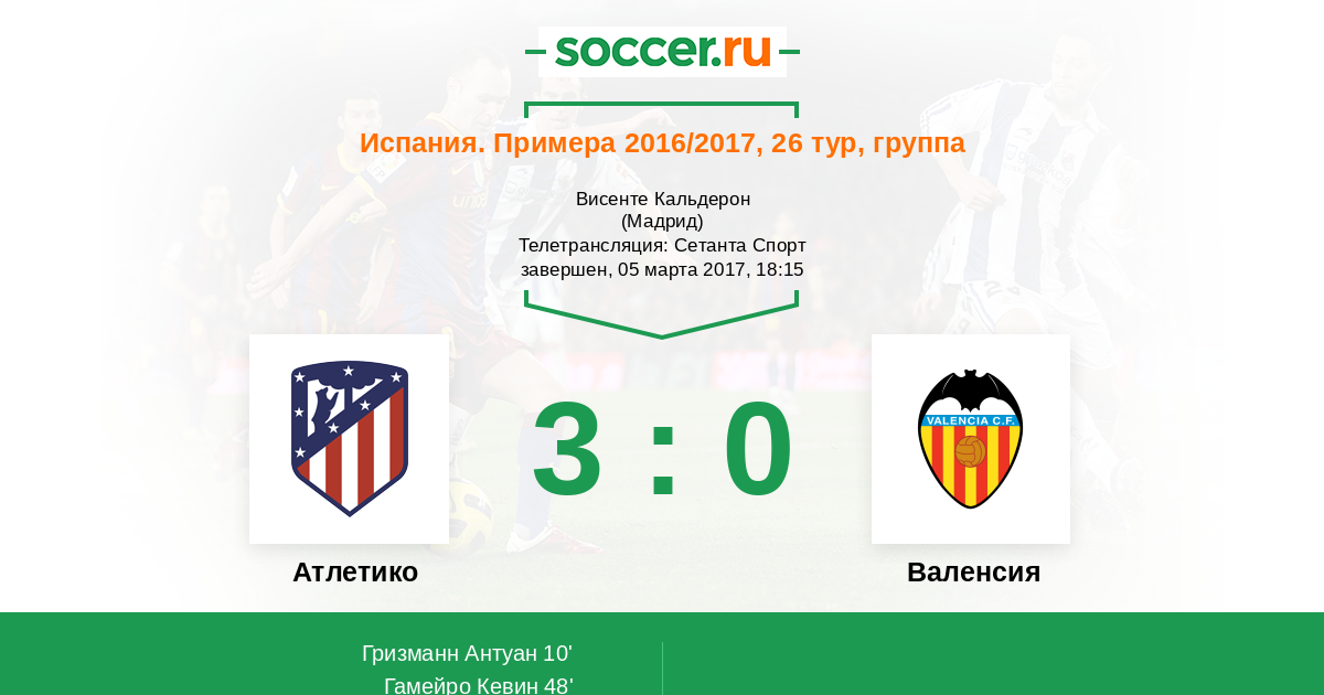 "Атлетико" продолжил стоять на своём и во втором тайме. Хозяева много атаковали, забили еще два гола и уверенно смотрелись в обороне. "Оранжевые" сегодня выглядели очень блекло, будем надеяться, что это не начало очередного спада. "Матрасники" возвращаются на четвёртое место, а Антуан Гризманн благодаря сегодняшнему дублю теперь в пятёрке лучших снайперов Примеры. "Валенсии" осталось дождаться результатов игр своих главных конкурентов. Текстовую онлайн-трансляцию провёл Глеб Васильев. Продолжайте следить за испанским футболом на "Соккер.Ру"!