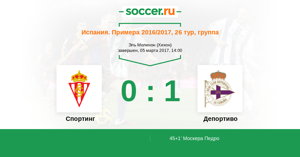Педро Москера (Депортиво) после подачи с углового головой вколачивает мяч в сетку, в правый угол ворот. Счет 0:1.