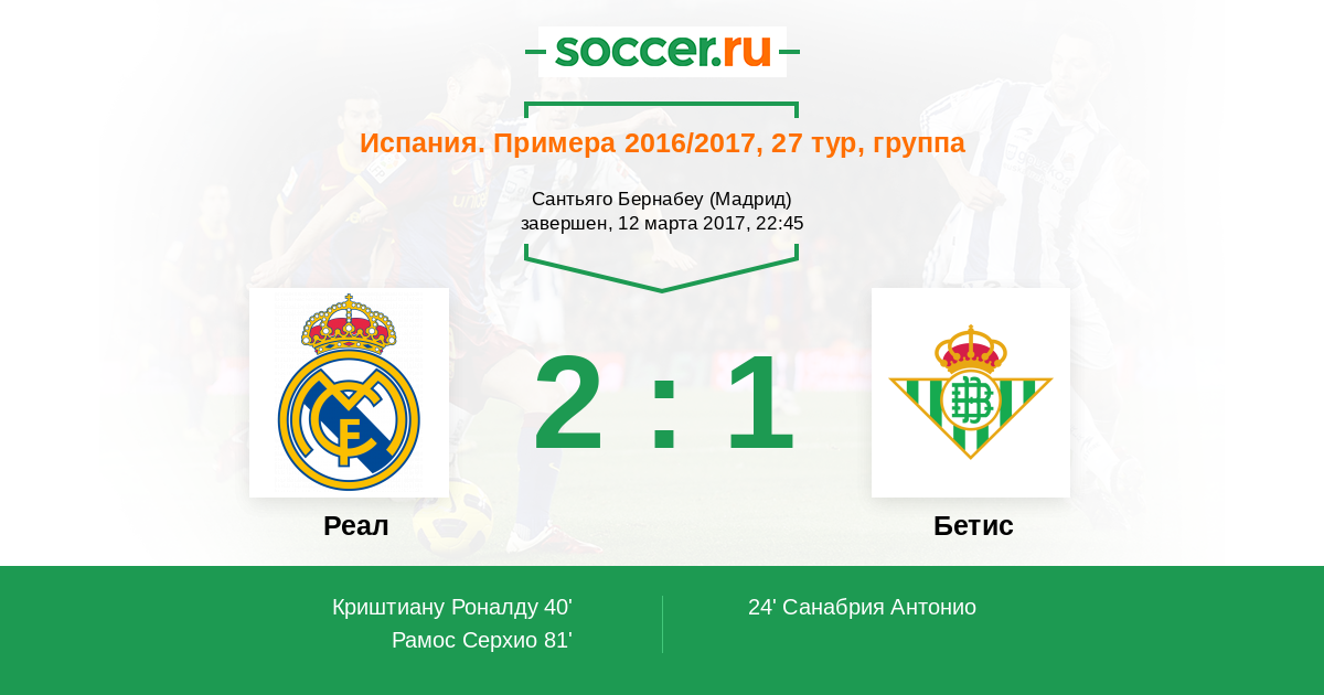 После того как "Барселона" несколькими часами ранее оступилась на "Риасоре" у "Королевского клуба" появился блестящий шанс не только вернуть себе первое место в таблице, но и оторваться от каталонцев на потенциальные 5 очков. Мадридисты продолжают считаться одними из главных фаворитах во всех турнирах, в которых они участвуют - речь о Примере и Лиге Чемпионов. Путёвка в четвертьфинал главного еврокубка была добыта в красивом противостоянии с "Наполи" - испанцы дважды обыграли итальянцев со счётом 3:1, хотя временами вопросы к игре подопечных Зидана возникали. Успехи в играх с "Наполи" и "Эйбаром" позволили "cливочным" сбить то напряжение, которое возникло после неудачных матчей с "Валенсией" и "Лас-Пальмасом". "Бетис"- это традиционно один из самых удобных соперников для мадридцев. В первом круге "Реал" не оставил камня на камне от андалусийцев, разгромив середняка на его поле с неприличным счётом - 1:6. Интересно, что уже в 6 играх кряду против "Бетиса" отличается Карим Бензема. Продолжит ли свою серию француз сегодня?