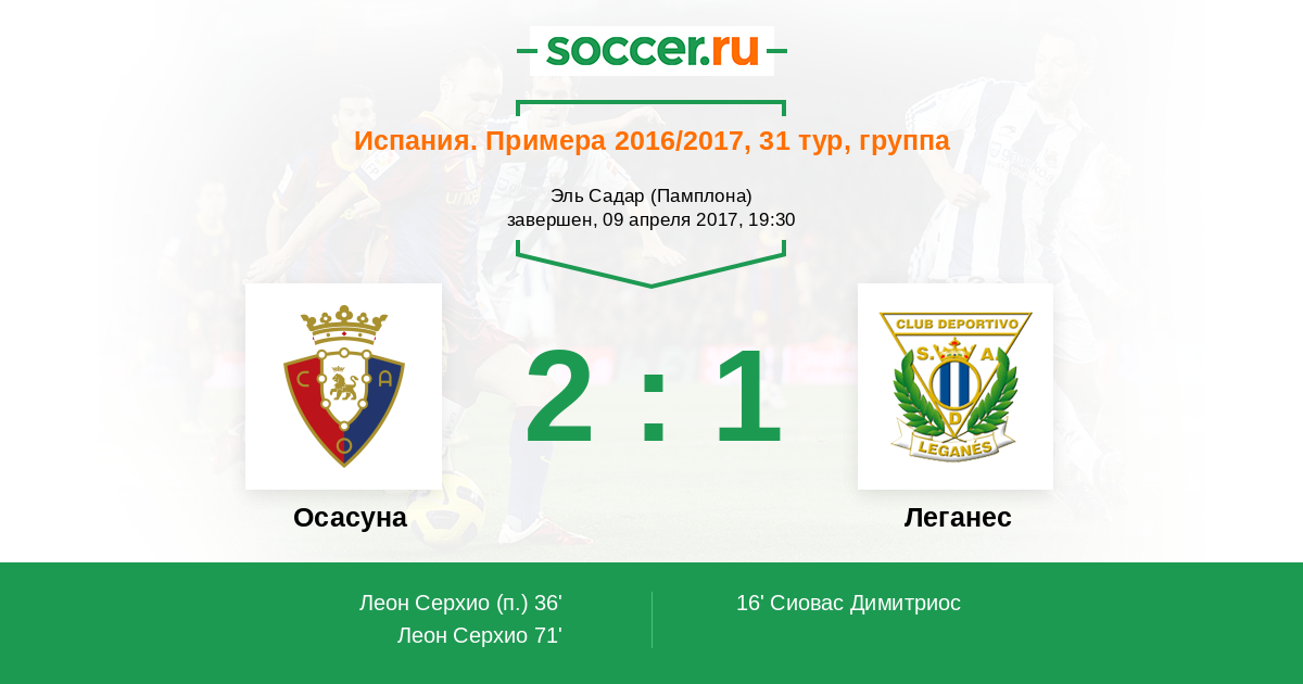 Алехандро Беренгер отравил отличный навес в штрафную. Серхио Серхио Леон (Осасуна) получил мяч и вогнал его в сетку. Голкипер был неспособен обить мяч, пущенный под перекладину. Счет теперь 2:1.