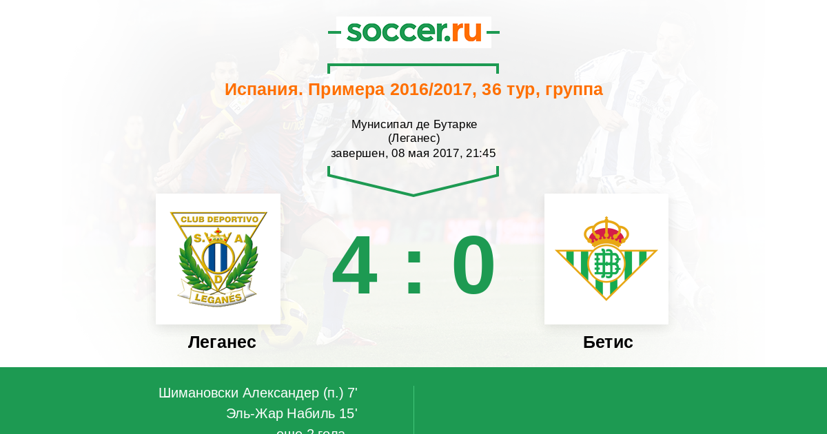 Рафаэль Наварро навешивает. Алекс Алегриа (Бетис) наносит удар головой, но мяч выше ворот проходит. Мяч ушел за линию ворот, и вратарь команды Леганес произведет удар от ворот.
